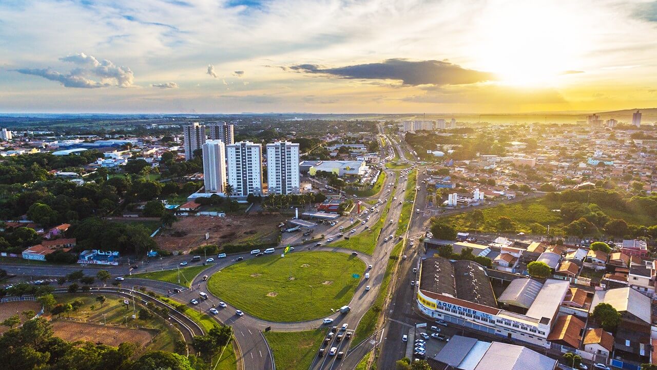 Cidade de Limeira em dia ensolarado: vista de cima da capital das joias de prata atacado.