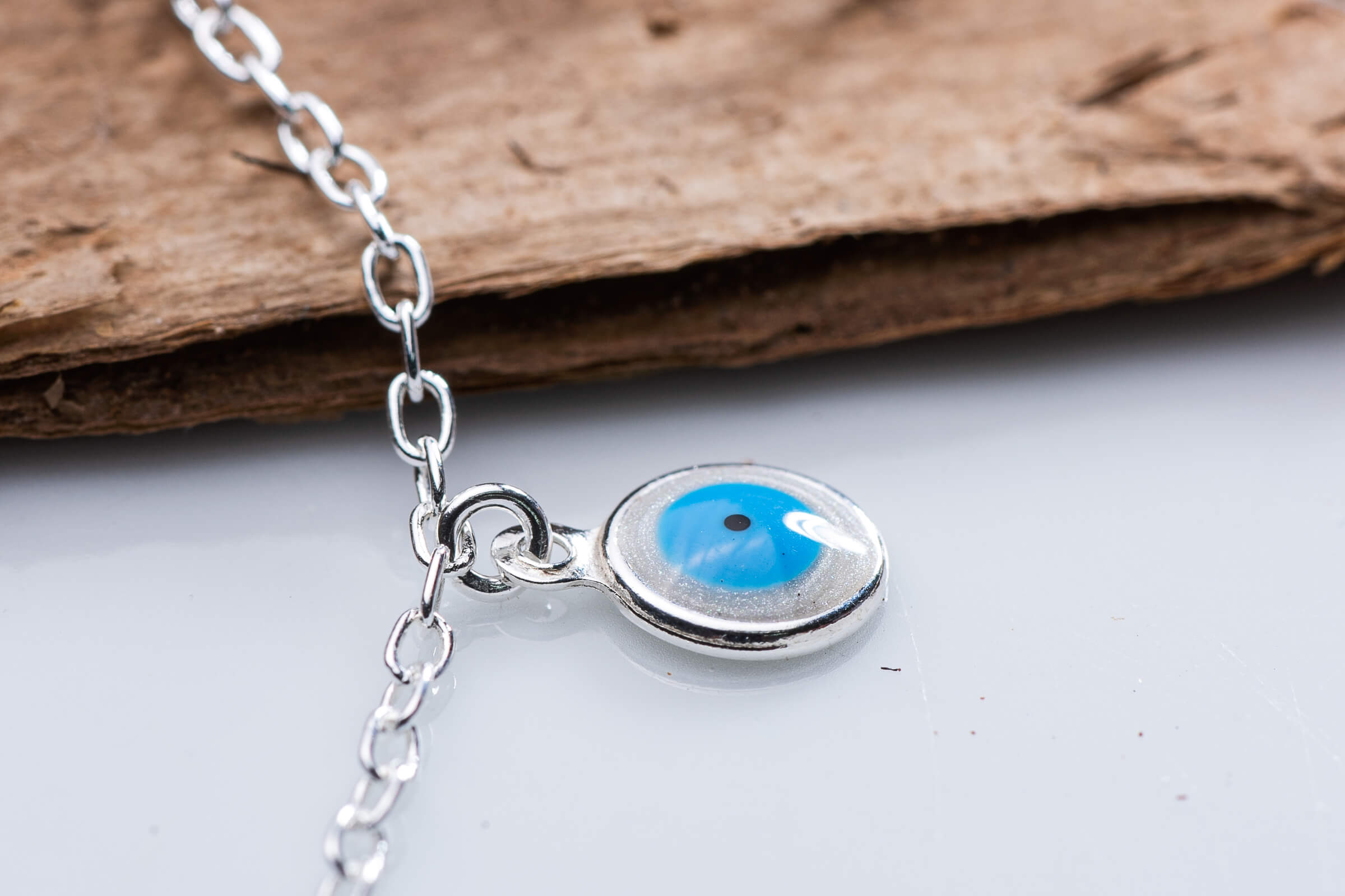 Pingente em prata 925 feito de resina sintética com o formato de olho grego.