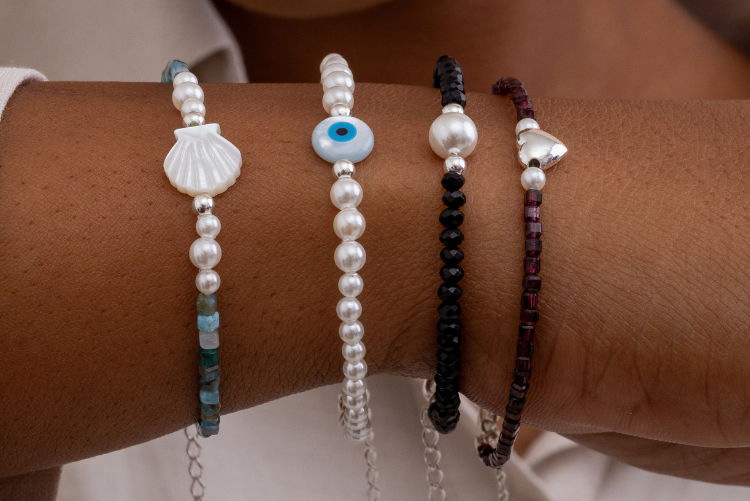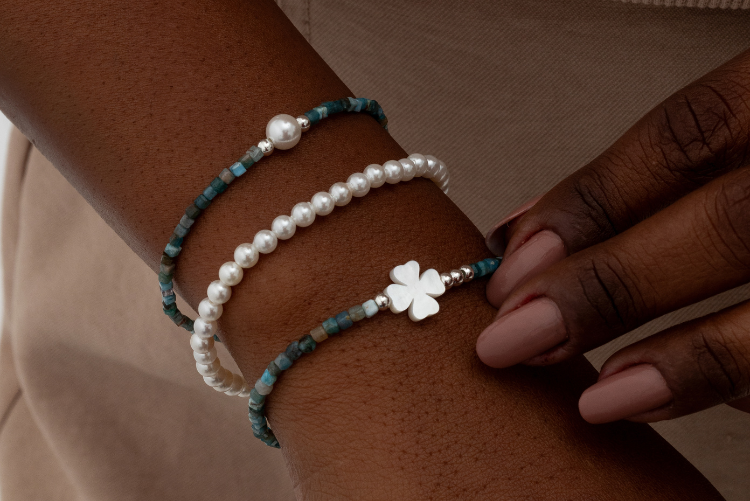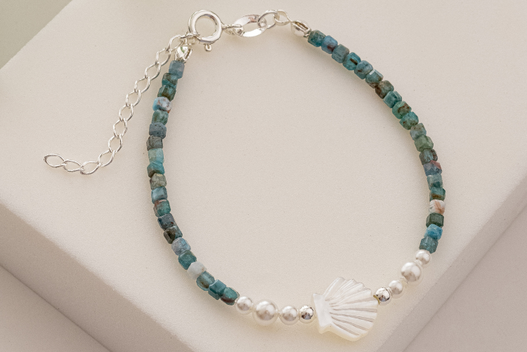 Por exemplo, temos esta joia incrível em nossa coleção: a pulseira com apatita. Ela combina elementos como concha, prata 925 e pérola shell, proporcionando uma peça delicada, romântica e bela.
